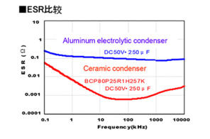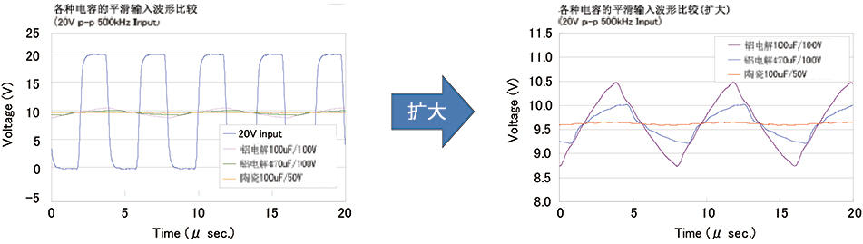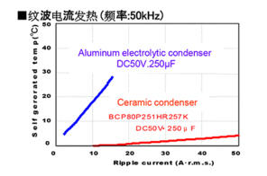PWM矩形波的滤波能力方面(比如开关频率500KHz),相对铝电解电容的470uF,块状陶瓷电容可以做到它的1/5, 100uF的滤波效果。而且开关频率越高,静电容值可以做到更小,以实现机器的小型化。