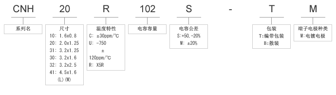 单位:㎜ 形式 L W T L1 L2 CNH10 1.6±0.2 0.8±0.15 0.6±0.15 0.2±0.15 0.5±0.2 CNH20 2.0±0.2 1.25±0.2 0.8±0.2