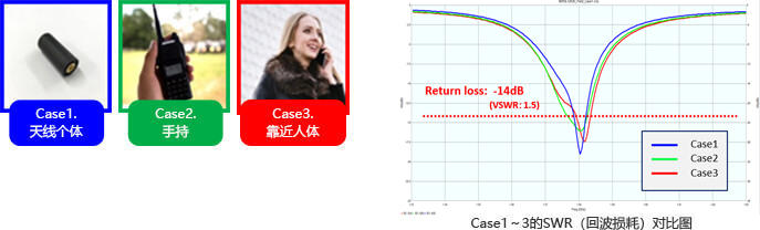螺旋天线具备优秀的抗干扰特性。如右侧图表的Case1.天线单独自由放置的时候,Case2.装入机器并拿在手上,Case3.将机器拿在手上并非常靠近人体,这些三种情况下回波损耗对比图。因产品可抗人体干扰,因此在任何状态下都能保持高精度。