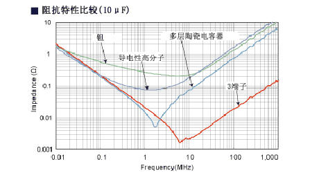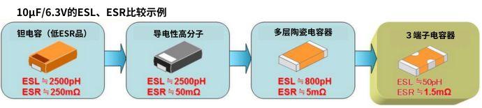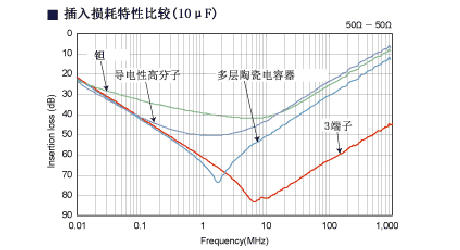 对比起一般的两端子电容器,三端子电容器的ESL(残留电感)以及ESR(等效电阻)降至极低,自身的共振频点高,因此在广域频率范围内的插入损耗的特性好。 可以只用一颗3端子电容替代传统的多电容组合的退耦电路。 应用于数码家电、电脑、汽车电子等的数字集成电路。